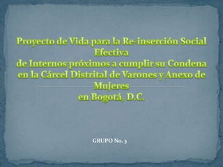 Este documento describe un proyecto de 14 semanas diseñado para que estudiantes de trabajo social en formación ayuden a internos de la cárcel distrital a desarrollar y fortalecer sus proyectos de vida. El proyecto incluye fases de estudio, intervención individual y familiar, y diagnóstico final para apoyar la reinserción social de los internos.