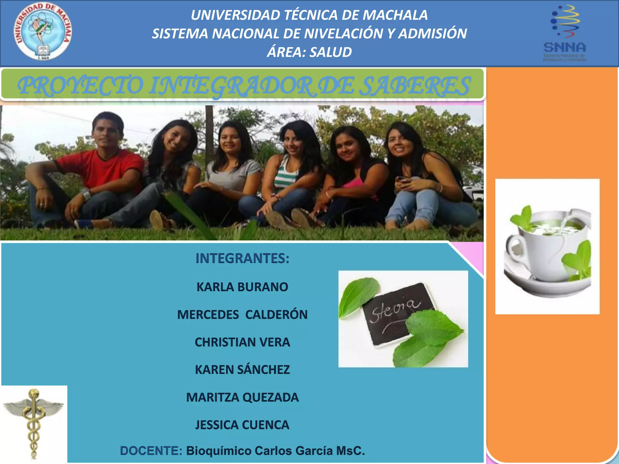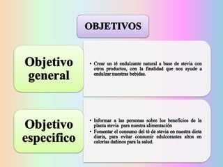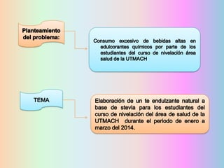 Este proyecto presenta la elaboración de un té endulzante natural a base de stevia por un grupo de estudiantes de la Universidad Técnica de Machala como requisito para aprobar el curso de nivelación. El té contiene stevia y otras especias y se propone como alternativa saludable para endulzar bebidas sin aportar calorías. El proyecto incluye la siembra de la planta, elaboración del té, encuestas y entrevistas para validar la propuesta, y un cronograma para su desarrollo.