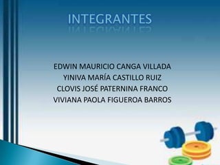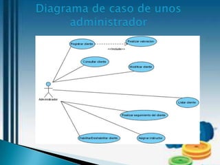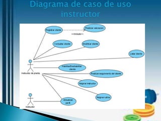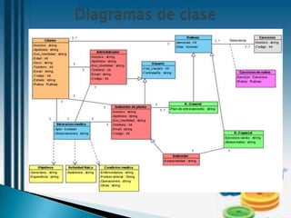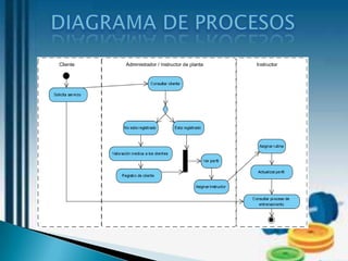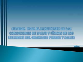 El documento describe un gimnasio llamado Fuerza y Salud que busca optimizar el monitoreo de la salud y condición física de sus usuarios mediante el desarrollo de un software. El software registrará los ejercicios y rutinas de los usuarios y asignará ejercicios de acuerdo a sus condiciones. Esto permitirá al gimnasio mejorar su servicio y organización.