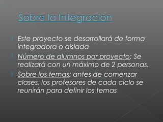 Este documento presenta las pautas y requisitos para el desarrollo de proyectos de investigación por parte de estudiantes. Indica que los proyectos pueden realizarse de forma individual o grupal, con un máximo de 2 personas por grupo. Detalla los componentes requeridos como la presentación del problema, objetivos, marco teórico, cronograma y bibliografía. Además, especifica los plazos y procesos de evaluación.