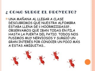 Este documento resume un proyecto escolar sobre hormigas realizado por niños de 3 años. Descubrieron hormigas en su aula y desarrollaron un gran interés en aprender más sobre ellas. Investigaron los tipos de hormigas, sus funciones, alimentación y partes del cuerpo. Hicieron hormigas de plastilina y las observaron con una lupa. Finalmente, crearon un hormiguero conjunto y aprendieron mucho sobre las hormigas.