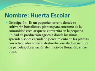 Este documento describe un proyecto de huerta escolar implementado en la Institución Educativa Nueva Granada. El proyecto buscaba desarrollar el espíritu emprendedor de los estudiantes mediante el cultivo de hortalizas y plantas. Los estudiantes propusieron la idea de la huerta escolar, diseñaron un plan de implementación con funciones específicas, y trabajaron en equipo durante varias semanas para establecer y cuidar la huerta. El proyecto enfrentó desafíos iniciales como daños causados por