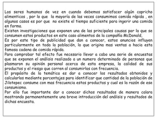 La encuesta aplicada a 30 personas en Jilotepec evaluó su percepción de McDonald's. Más del 80% conocía cadenas de comida rápida y a McDonald's. Aunque la mayoría había consumido sus productos, también creían que su comida no es saludable y que sus precios no son accesibles para toda la población. La televisión fue el medio publicitario más reconocido de McDonald's, aunque la sucursal más cercana estaba a más de 5 km para el 90% de los encuestados.