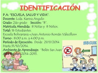 Este documento presenta un proyecto educativo para estudiantes de 2do grado sobre la salud, la prevención de enfermedades y los riesgos. El proyecto abarca temas como el cuidado del cuerpo, enfermedades virales comunes, desastres naturales y la importancia de hábitos de vida saludables. Incluye actividades prácticas como discusiones, dibujos, ejercicios matemáticos y juegos para crear conciencia sobre estos temas importantes.