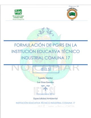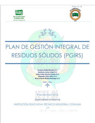 Este documento presenta un plan de gestión integral de residuos sólidos (PGIRS) para la Institución Educativa Técnico Industrial Comuna 17. Describe brevemente la institución y su misión. Luego, introduce el problema de la falta de conciencia ambiental y separación adecuada de residuos. Se realizaron concientizaciones a estudiantes y maestros con ayuda del Jardín Botánico, y un aforo de residuos para cuantificarlos. El documento contiene el marco conceptual, legal y teórico, así como la metod