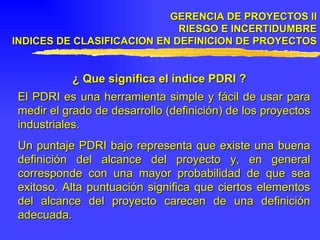 El documento describe el Índice de Clasificación en Definición de Proyectos (PDRI), una herramienta para medir el grado de definición de un proyecto. Cuanto menor sea la puntuación PDRI de un proyecto, mayor será la probabilidad de éxito, dado que indica una mejor definición del alcance. El PDRI evalúa tres secciones clave del proyecto a través de categorías y elementos, asignando puntajes para cada uno. Estudios muestran que proyectos con puntajes PDRI menores a 200 ti