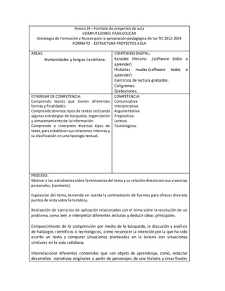 Este documento describe un proyecto para mejorar la comprensión lectora y capacidad de síntesis en estudiantes de sexto grado en el Instituto Técnico Laguna de Ortices en Colombia a través del uso de las tecnologías de la información y comunicación (TIC). El proyecto utilizará recursos educativos digitales como un blog, software educativo y videos para enseñar diferentes estrategias de lectura. El objetivo es que los estudiantes desarrollen mejor sus habilidades de comprensión lectora y producción escrita para obtener me