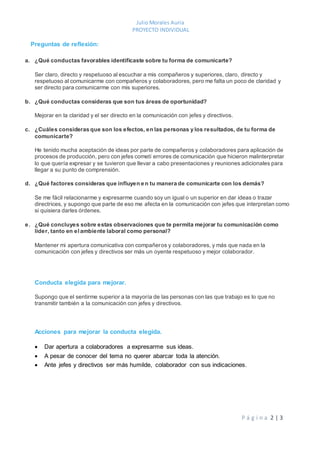 Este documento presenta el autodiagnóstico y proyecto individual de Julio Morales Auria para mejorar su comunicación. Completó una tabla de autodiagnóstico sobre su comunicación que mostró áreas de oportunidad al comunicarse con jefes. Respondió preguntas de reflexión que concluyeron que debe ser más humilde y colaborador al comunicarse con jefes. Eligió mejorar transmitiendo menos superioridad y propuso acciones como dar más apertura a otros y ser menos dominante ante jefes.