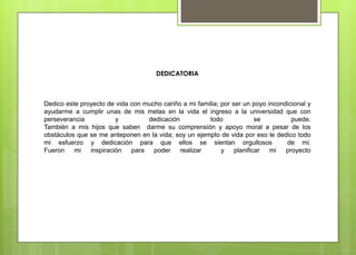 El documento es una dedicatoria y agradecimiento de Diana Lucia Erraiz Berrezueta a su familia por su apoyo incondicional que le ha permitido cumplir su meta de ingresar a la universidad a pesar de los obstáculos. También agradece a Dios y a docentes que la han ayudado a desarrollar su capacidad competitiva.