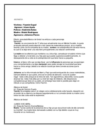 El documento presenta un proyecto de cortometraje sobre el tema del sexting realizado por estudiantes de preparatoria. Narra la historia de una joven llamada Yazmin que es engañada por un compañero llamado Iriam para que le envíe fotos íntimas, las cuales él luego comparte sin su consentimiento. Esto causa que Yazmin sea humillada públicamente y entre en depresión. Su madre la apoya para denunciar a Iriam y a otra compañera que lo ayudó. Ambos son arrestados por la policía por dañar
