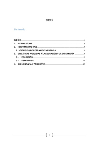 Este documento presenta una introducción a las herramientas web y ofimáticas aplicadas a la educación y la enfermería. Explica algunas herramientas web como Mindmeister, MediaWiki, Google Docs y WordPress. Luego describe cómo se pueden usar herramientas ofimáticas como Drive, Dropbox, Gmail, Hotmail y Mendeley en la educación, así como Epi Info y Quipux en la enfermería. El documento proporciona ejemplos de cómo estas herramientas mejoran los procesos educativos y de enfermería.