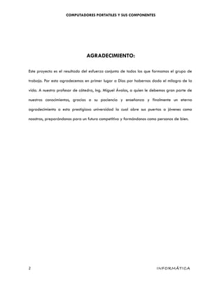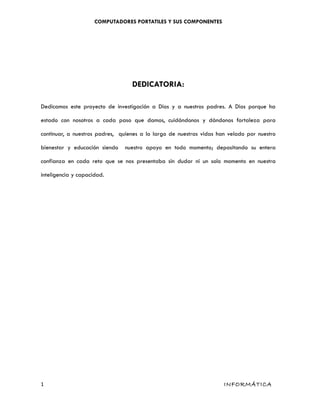Este documento describe los componentes internos y externos de las computadoras portátiles. Explica que los componentes internos incluyen el microprocesador, memoria RAM, tarjeta de video, disco duro, y unidades ópticas y magnéticas. Los componentes externos son la pantalla, teclado, almohadilla táctil, mouse, cámara web y puertos. También describe los tipos de computadoras portátiles como cuaderno, subcuaderno y microcomputadora de bolsillo.