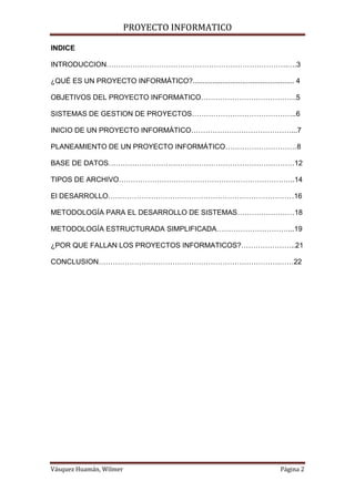 Este documento describe los conceptos básicos de un proyecto informático. Explica que un proyecto informático es un conjunto de actividades interrelacionadas con un inicio y final definidos que utilizan recursos limitados para lograr un objetivo deseado relacionado con un sistema de información. También describe los objetivos, tipos y componentes clave de un sistema de gestión de proyectos informáticos como la planificación, información, control, técnicas y metodologías.