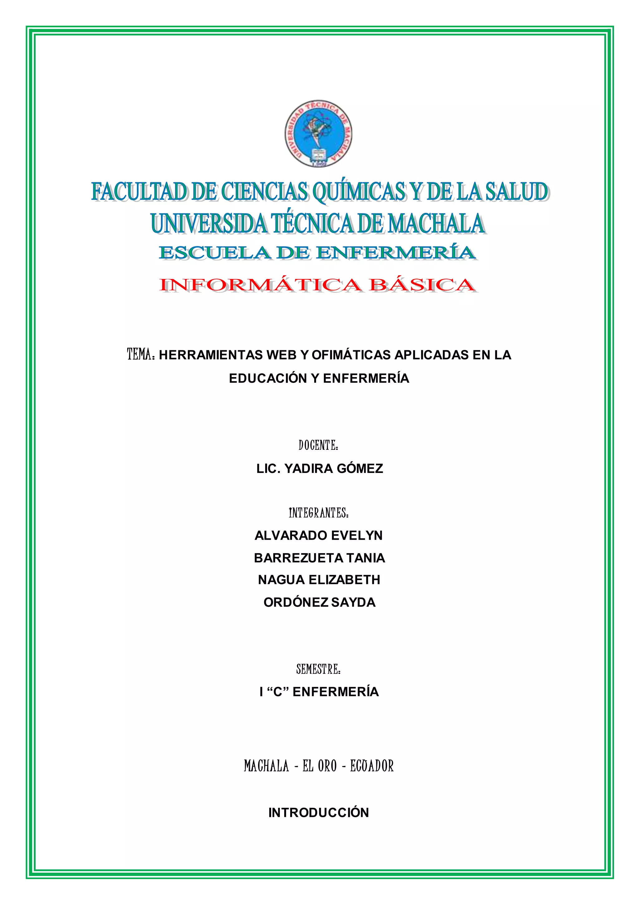 El documento describe las herramientas web y ofimáticas aplicadas en la educación y enfermería. Explica programas como Word, Excel y PowerPoint y cómo se usan para crear documentos, hojas de cálculo y presentaciones. También describe wikis, que permiten que múltiples usuarios editen páginas web de forma colaborativa, y las TIC como conjunto de tecnologías para procesar y transmitir información.