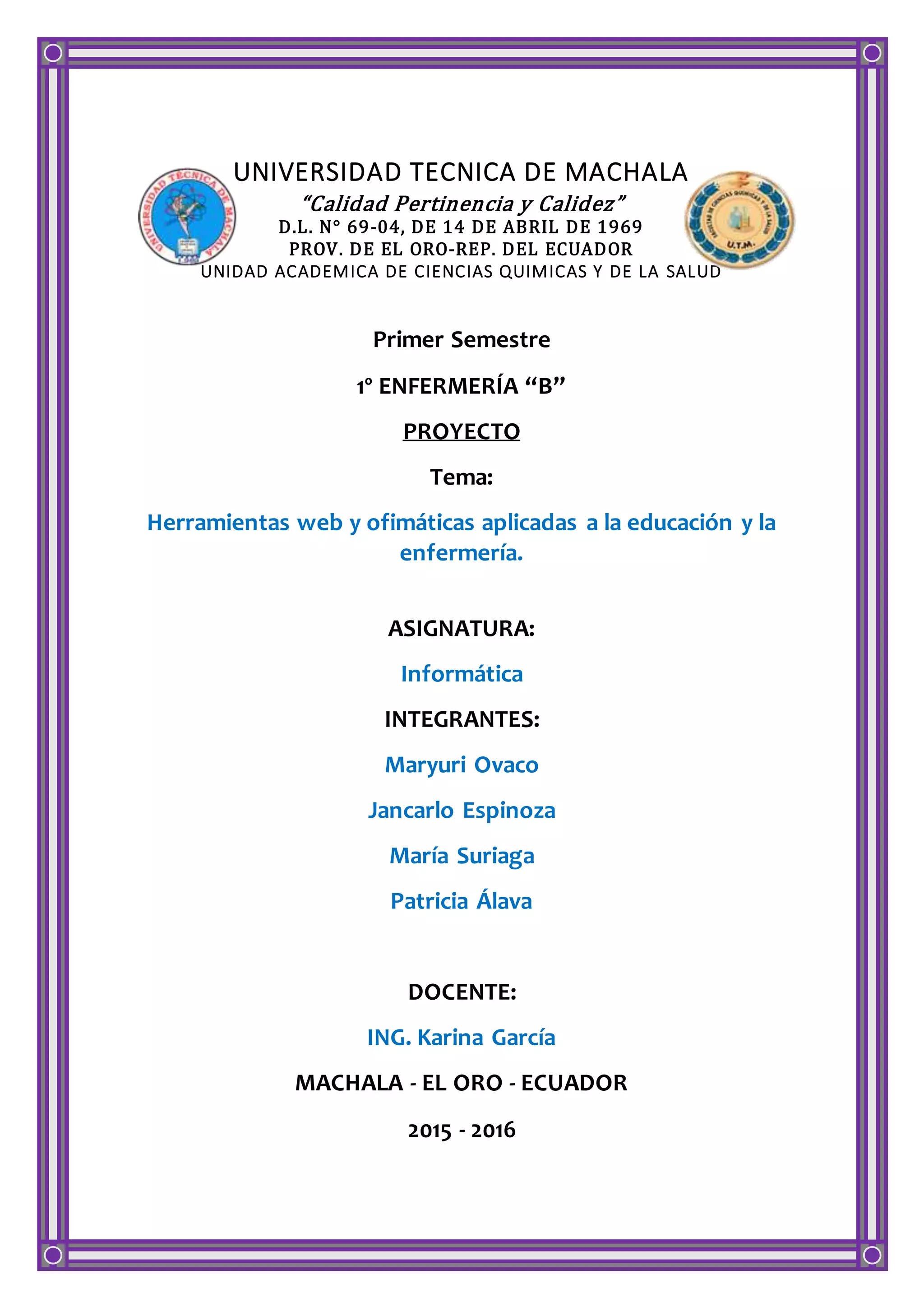 El documento presenta una introducción sobre las herramientas web y ofimáticas aplicadas a la educación y la enfermería. Luego describe algunas herramientas web como Mindmeister, MediaWiki, Google Docs y WordPress que permiten la colaboración y edición en línea de documentos. También explica cómo herramientas ofimáticas como Drive, Dropbox, Gmail, Hotmail y Mendeley pueden usarse en la educación para almacenamiento en la nube, correo electrónico, gestión de referencias bibliográficas y más. Finalmente, menc
