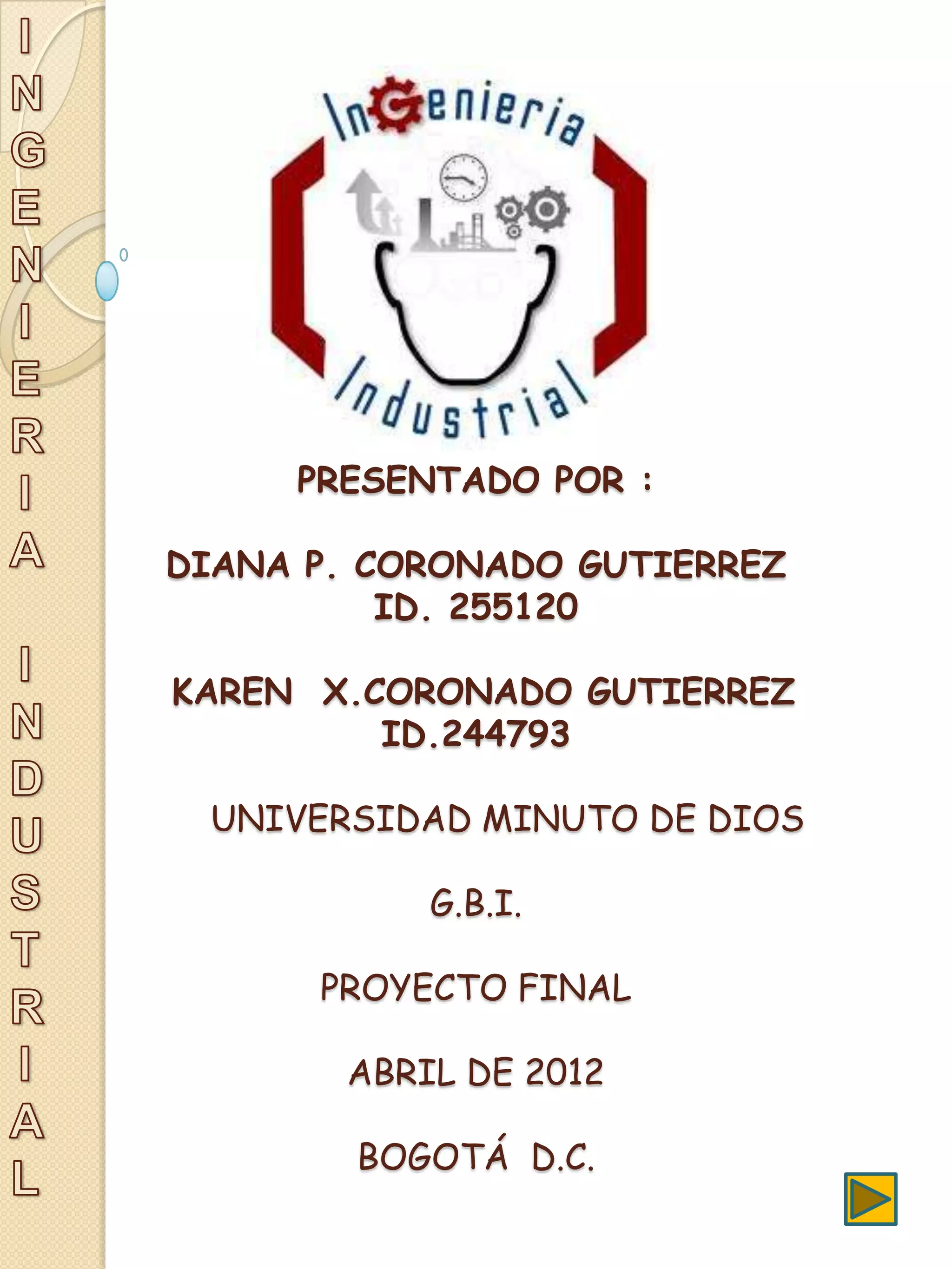 Este documento presenta la carrera de ingeniería industrial. Explica que los ingenieros industriales son profesionales capacitados para evaluar escenarios empresariales y diseñar planes y proyectos. También describe los objetivos de la carrera como identificar la vocación de cada estudiante y conocer los campos de acción e industriales en los que pueden trabajar los ingenieros. Finalmente, concluye que estudiar ingeniería industrial es una decisión acertada debido a la alta demanda por estos profesionales.