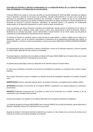 La auditoría de gestión del proyecto INNOVANDES de la Fundación MARCO en Riobamba evaluó la eficiencia, eficacia y efectividad en el uso de los recursos. Se determinó que los recursos no se estaban optimizando y que se requiere un mejor manejo para cumplir las metas y objetivos. La auditoría analizó variables como servicios, asistencia técnica, sistemas y beneficiarios para verificar el cumplimiento y mejorar el desempeño de la organización.