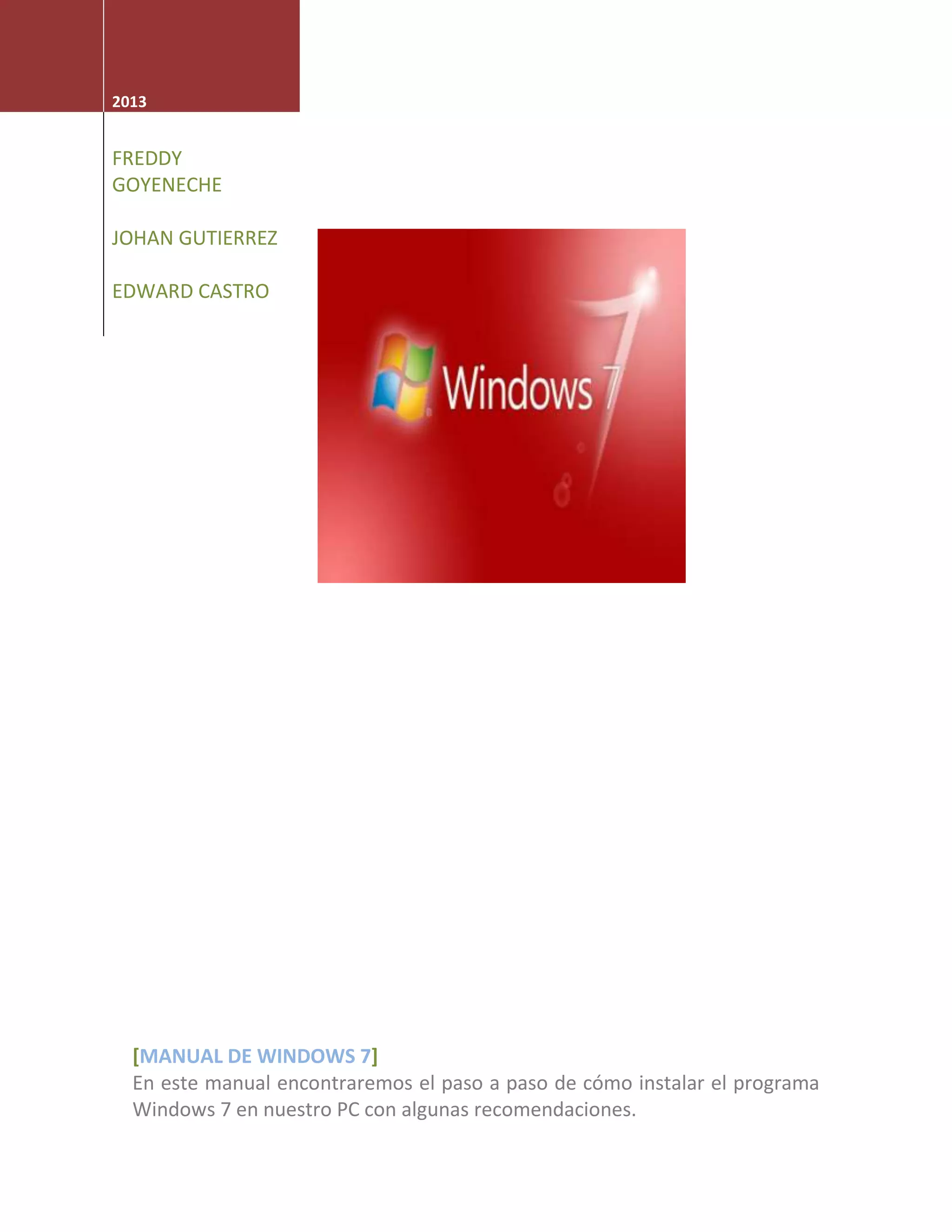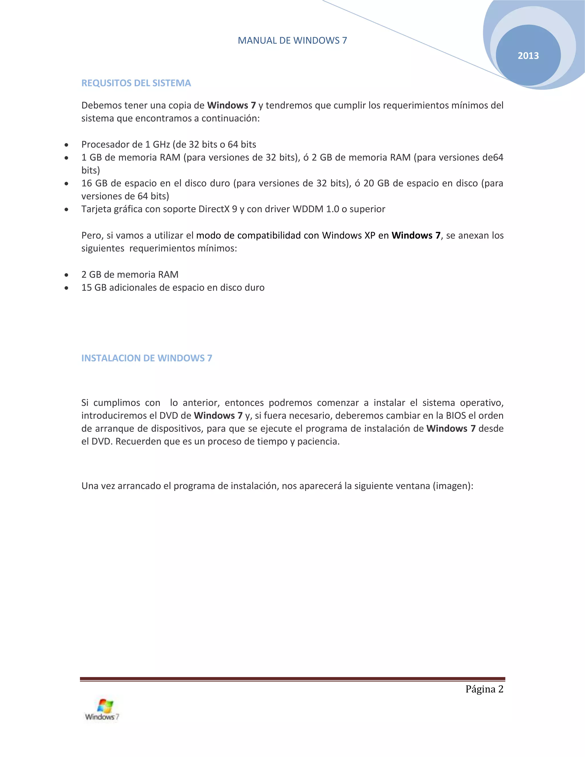 Este manual explica los pasos para instalar Windows 7 en una PC, incluyendo los requisitos mínimos del sistema como 1 GB de RAM y 16 GB de espacio en disco, y detalla el proceso de instalación paso a paso, como introducir el DVD de Windows 7, particionar el disco duro, instalar el sistema operativo, configurar la cuenta de usuario y contraseña, y finalmente ver la pantalla del escritorio una vez completada la instalación.