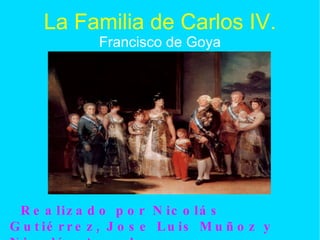 El cuadro La familia de Carlos IV de Goya retrata a la familia real española posando en una estancia del palacio. Goya se coloca a la izquierda pintando un gran lienzo en penumbra. Retrata a los miembros de la familia real de manera individualista captando su personalidad sin juzgarlos. El cuadro también incluye dos lienzos de fondo con paisajes y mitología que representan el origen de la dinastía.