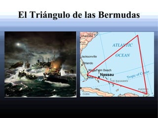 El documento describe el Triángulo de las Bermudas, una zona del océano Atlántico donde se han producido numerosas desapariciones de aviones y barcos. Explica su ubicación entre Florida, Puerto Rico y las islas Bermudas, y analiza posibles explicaciones mitológicas, como la presencia de monstruos marinos, así como varios casos históricos de desapariciones aéreas y navales, como los del Vuelo 19 de la Armada de EE.UU. y el barco USS Cyclops. Finalmente, ofrece una
