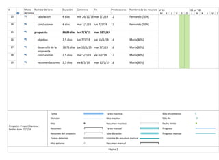 Este documento presenta un plan de proyecto que consta de 19 tareas para implementar un proyecto sobre redes. El proyecto comienza el 18 de julio de 2018 y finaliza el 12 de febrero de 2019. Se asignan recursos como Cesar Lagos, Carlos, Maria y Fernando para completar las diferentes tareas del proyecto.