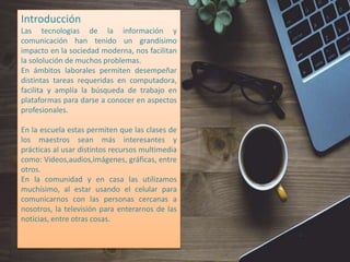 Las tecnologías de la información y comunicación (TIC) han transformado significativamente la sociedad, mejorando la comunicación, el acceso a la información y la educación. En la comunidad, se utilizan en el trabajo y la escuela, facilitando la realización de tareas y la interacción social. Además, las TIC permiten la difusión de información y discusión de problemáticas sociales, destacando la importancia del uso responsable de estas herramientas.