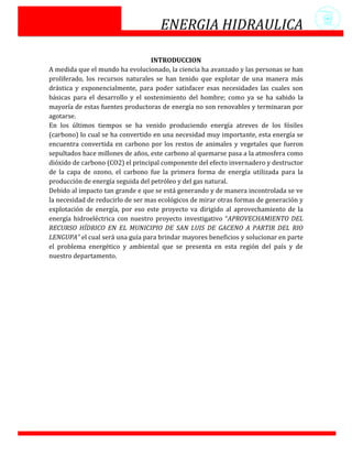 El documento trata sobre el aprovechamiento de la energía hidráulica en el municipio de San Luis de Gaceno a partir del río Lengupa. El objetivo general es proporcionar una metodología de investigación para solucionar problemas energéticos y ambientales en la región utilizando recursos hídricos. Se explican conceptos como energía hidroeléctrica, centrales hidroeléctricas y tipos de energías renovables, además del marco legal e impactos ambientales positivos del proyecto.