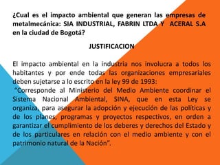 Este documento describe un proyecto que analizará el impacto ambiental de tres empresas metalmecánicas en Bogotá a través de encuestas a sus trabajadores y vecinos. El objetivo es identificar las causas de contaminación y generar una cartilla con los hallazgos y un análisis de los efectos ambientales de estas empresas.