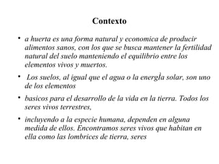 Este documento describe un proyecto de huerta escolar en Colombia que busca crear un huerto sostenible y productivo donde los estudiantes, padres y la comunidad puedan aprender sobre cultivo de alimentos y adoptar hábitos alimenticios saludables. El proyecto también tiene como objetivo utilizar herramientas TIC para mostrar las actividades de la huerta y motivar a los estudiantes.