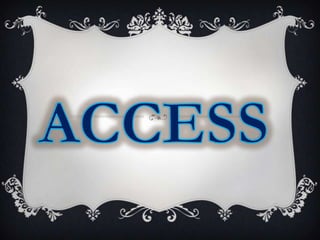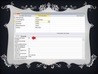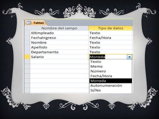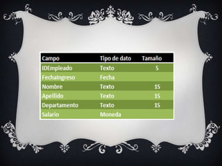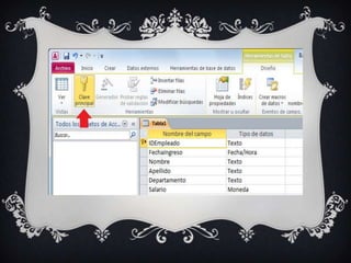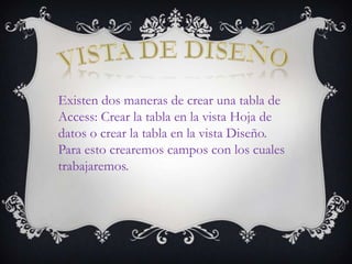 Este documento describe cómo crear una tabla en Access mediante dos métodos: en la vista Hoja de datos o en la vista Diseño. Explica que en la vista Diseño se debe hacer clic en el botón "Diseño de tabla" y luego agregar los campos requeridos especificando su nombre y tipo de datos. También indica que el campo clave principal debe establecerse usando el botón "Clave principal" y que las propiedades de cada campo pueden modificarse individualmente.