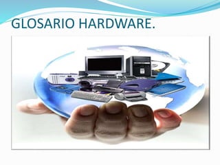 El documento proporciona definiciones de 20 términos clave de hardware, incluyendo tipos de puertos (AGP, PCI, PCIE), estándares de almacenamiento (ATA/IDE, PATA, SATA, SCSI), componentes (RAID, BIOS, CPU, chipset, FSB), y conectores (jumper, USB, VGA, DVI, HDMI). El documento también incluye enlaces a sitios web de tecnología para obtener más información.
