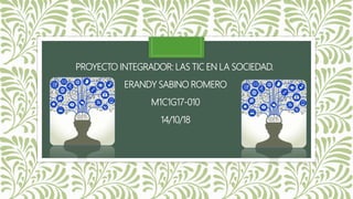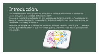 Este documento describe cómo las tecnologías de la información y la comunicación (TIC) se usan en la sociedad. Explica que una sociedad de la información es aquella donde la creación, distribución y manipulación de información son actividades importantes. Luego detalla cómo las TIC se usan en la comunidad del autor y de un amigo para mantener grupos y comunicarse. Concluye que las TIC influyen en el entorno humano y deben usarse de manera correcta e introducirse más en la vida cotidiana.