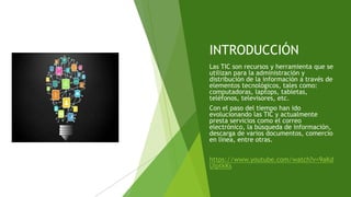 Este documento describe cómo se usan las tecnologías de la información y la comunicación (TIC) en la comunidad del autor y la comunidad de su compañero. Explica que en la comunidad del autor, las personas usan aplicaciones como WhatsApp y Telegram para promover sus negocios y mantener informados a los vecinos. En la comunidad del compañero, usan WhatsApp para grupos de seguridad y Facebook para reportar aglomeraciones y accidentes. Concluye resaltando la importancia creciente de las TIC en diferentes ámbitos como la educación y el des
