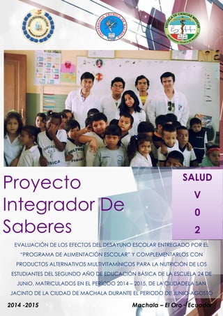 Este proyecto evalúa los efectos del desayuno escolar entregado por el Programa de Alimentación Escolar (PAE) en los estudiantes de segundo año de educación básica de la Escuela Fiscal Mixta "24 de Junio" en Machala, Ecuador. Se investigó si el desayuno proporciona los nutrientes necesarios para el rendimiento académico y se propuso complementarlo con un pack alimenticio multivitamínico. Se realizaron encuestas a profesores y estudiantes, se midió el peso y talla de los