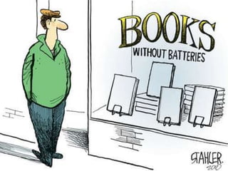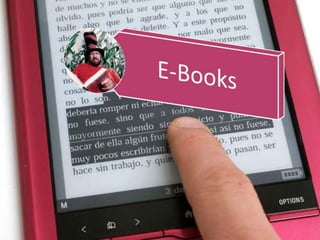El documento describe los libros electrónicos (eBooks), incluyendo su definición, ventajas como la entrega instantánea y facilidad de distribución, inconvenientes como la dependencia de la conexión a Internet y batería limitada, y su origen y evolución desde el Proyecto Gutenberg en 1971 hasta su desarrollo comercial en la década de 1980. Finalmente, plantea si los eBooks reemplazarán eventualmente a los libros tradicionales.