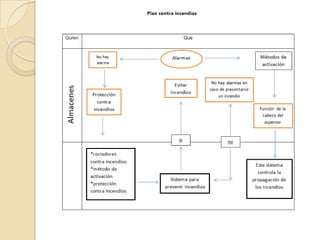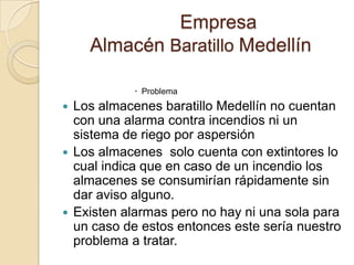 El documento aborda la falta de sistemas de alarma y riego contra incendios en los almacenes Baratillo de Medellín, lo que crea un alto riesgo en caso de incendio. Propone implementar un sistema de rociadores y capacitar al personal para minimizar pérdidas y proteger a los trabajadores. Se identifican debilidades en la seguridad actual y se busca concienciar a los administradores sobre la necesidad de este sistema de protección.