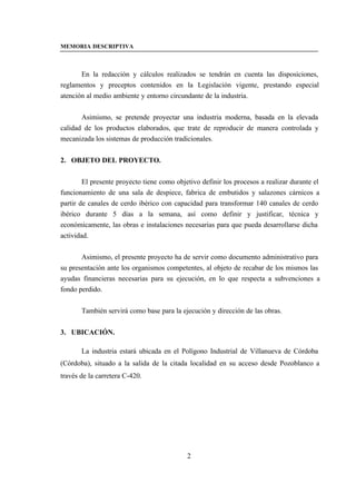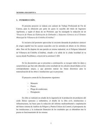 Este documento presenta un proyecto para establecer una planta de elaboración de embutidos y salazones cárnicos en Villanueva de Córdoba, España. El proyecto incluye estudios de ingeniería de procesos para la producción de jamones, embutidos y otros derivados del cerdo ibérico, así como el diseño de las instalaciones, equipos y procesos requeridos. El objetivo es aprovechar la demanda creciente de estos productos cárnicos españoles de alta calidad de manera rentable y sostenible