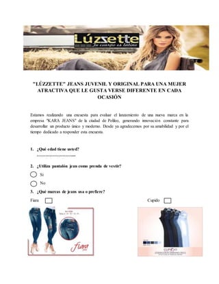 El documento presenta una encuesta realizada para evaluar el lanzamiento de la nueva marca de jeans 'lúzzette', enfocada en mujeres jóvenes que buscan prendas innovadoras. Los resultados indican que el público objetivo prefiere modelos específicos y se preocupa más por cómo les queda la prenda que por la marca o el precio. Un 93.9% de los encuestados mostró interés en probar la nueva marca, lo que sugiere una alta factibilidad para su lanzamiento en el mercado.