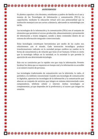 Este documento propone capacitar a docentes, estudiantes y padres en el uso de las Tecnologías de la Información y Comunicación (TIC) para mejorar la educación. Explica que las TIC son herramientas que permiten acceder, producir y compartir información. También destaca las ventajas de la educación virtual y el uso de las TIC en la enseñanza y el aprendizaje. Finalmente, justifica la necesidad de capacitar a los docentes en el uso de las TIC para aprovechar mejor sus conocimientos y experiencia en el aula