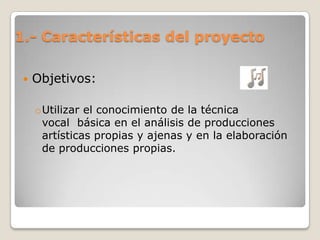 El proyecto "KANTACONMIGO" tiene como objetivos utilizar la técnica vocal y materiales como la música, imagen y sonido para expresión artística, desarrollar confianza y respeto en las creaciones propias y ajenas, y fomentar la colaboración y curiosidad tecnológica. El proyecto usa videos musicales en la web para facilitar el aprendizaje vocal e integra las TIC en las aulas. Colegios de toda España participan y ha recibido el premio "Peonza de plata" por su energía