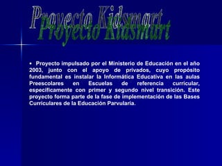 El proyecto Kidsmart, impulsado por el Ministerio de Educación en 2003, buscó implementar la informática educativa en salas preescolares a través de computadores con programas educativos. Los programas abordaron temas como matemáticas, ciencias, tiempo, geografía y desarrollo de habilidades. El proyecto tuvo impactos positivos en los aprendizajes de los niños, el trabajo de los educadores, la colaboración entre pares y el apoyo de directivos y familias.