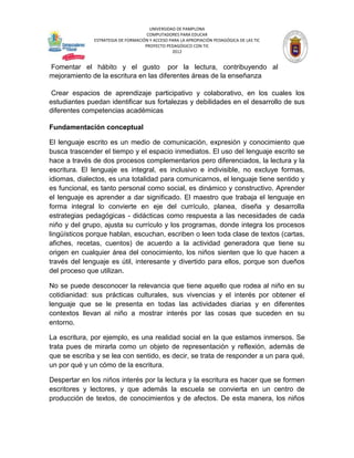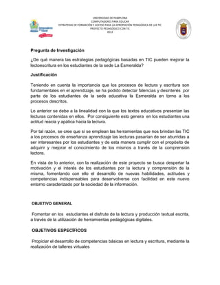 Este documento describe un proyecto para mejorar la lectoescritura en estudiantes mediante el uso de herramientas TIC. El proyecto busca motivar a los estudiantes y desarrollar habilidades a través de talleres virtuales. El objetivo general es fomentar el disfrute de la lectura y escritura, y los objetivos específicos incluyen desarrollar competencias básicas y crear espacios de aprendizaje colaborativo. La metodología incluye actividades guiadas por el docente en línea y fuera