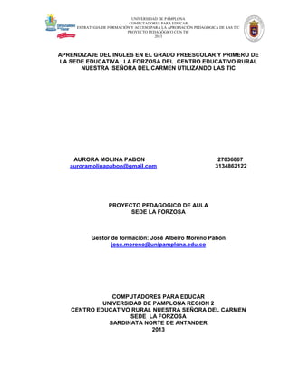 Este documento presenta un proyecto pedagógico para facilitar el aprendizaje del inglés en los grados preescolar y primero de la sede educativa La Forzosa utilizando herramientas TIC. El proyecto tiene como objetivo elaborar material didáctico digital y explorar contenidos educativos de inglés en los computadores donados para motivar a los estudiantes. Se justifica el uso de las TIC para hacer las clases más atractivas para los niños pequeños. El proyecto se basa en teorías como las de Piaget