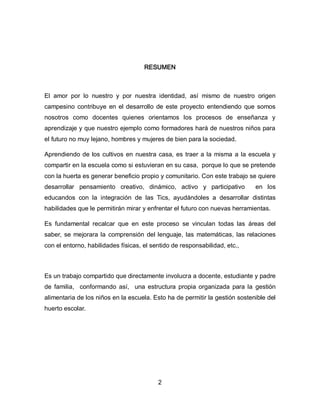 Este documento describe un proyecto pedagógico que implementa una huerta escolar en la Sede La Raya del Centro Educativo Rural Vijagual en La Esperanza, Norte de Santander, Colombia. El proyecto busca aplicar una metodología de enseñanza activa e investigativa que vincule las áreas del saber con los niños de grados 4 y 5 mediante el cultivo de una huerta. Se espera que esto mejore la comprensión de los estudiantes en áreas como matemáticas y lenguaje, desarrolle habilidades y valores