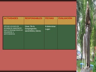 El documento presenta el plan de formación laical del Colegio Internacional María Inmaculada, cuyo objetivo es promover el liderazgo a través de una sólida formación de los laicos de la comunidad educativa. El plan incluye actividades como la eucaristía, encuentros espirituales y catequesis, con el fin de que los laicos sean testimonio de Cristo y líderes evangelizadores comprometidos con la iglesia y la educación desde valores católicos.