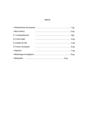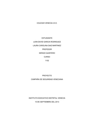 Este documento presenta un proyecto de campaña de seguridad para el colegio Venecia en Bogotá realizado por dos estudiantes y su profesor. Incluye un índice del contenido, una descripción del proyecto, un marco teórico con la contextualización del colegio Venecia y su barrio, el marco legal referente a la ley de desarrollo de 1994, y metodología e información bibliográfica. El objetivo general es mejorar la seguridad en el colegio mediante estrategias para prevenir problemas como