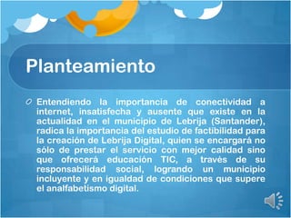 El documento propone el desarrollo de un estudio de factibilidad para crear Lebrija Digital, una empresa que llevaría conectividad a internet de alta velocidad y bajos costos a los habitantes del municipio de Lebrija en Colombia. El estudio analizaría la demanda, infraestructura requerida, y planes de internet a ofrecer. El objetivo es mejorar el acceso a internet en la región y promover la inclusión digital.
