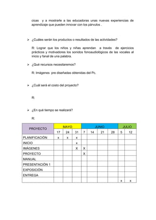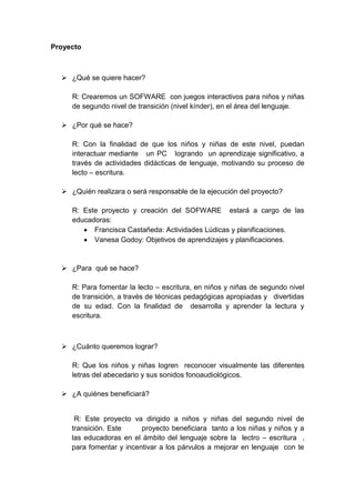 El documento describe un proyecto para crear un software con juegos interactivos para niños de kínder para fomentar el aprendizaje del lenguaje. El proyecto estará a cargo de dos educadoras y tiene como objetivo que los niños reconozcan las letras y sus sonidos a través de actividades didácticas y lúdicas.