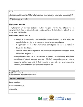 Este documento presenta un proyecto pedagógico para implementar el uso de las TIC con el objetivo de mejorar la comprensión lectora en estudiantes de cuarto grado. El proyecto consiste en tres actividades: 1) visitas a bibliotecas, 2) uso de programas educativos en línea, y 3) creación de textos digitales. El proyecto será implementado durante tres meses y evaluará los avances de los estudiantes a través de la observación y resultados de las actividades.