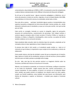 Este proyecto busca fortalecer las habilidades de lectura y escritura de los estudiantes a través de diferentes actividades a lo largo del año escolar. Los estudiantes escribirán sus propios textos en diferentes géneros como cuentos, mitos y biografías, los cuales serán corregidos y mejorados. El objetivo general es desarrollar la comprensión lectora y las habilidades de escritura de una manera gradual. Adicionalmente, se busca motivar a los estudiantes a leer y escribir de forma públic